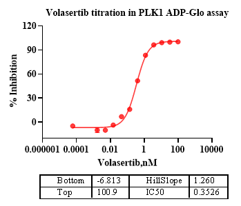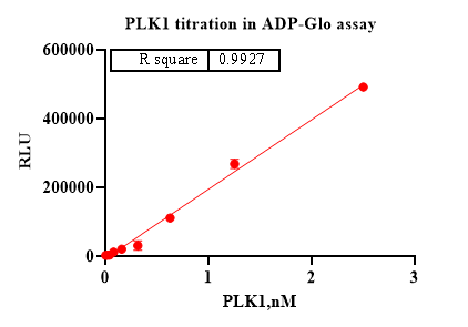 The PLK1 activity was detected using Ultra Luminescence technology. The reaction was performed by incubating the PLK1 protein, ATP and substrate at 25℃ for 60 min, then adding ADP-Glo reagent and reading RLU signal with BMG.