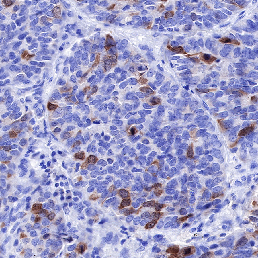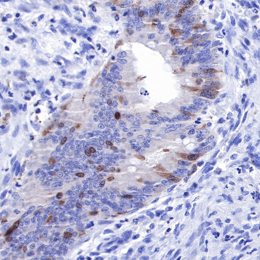 IHC shows positive staining in paraffin-embedded human lung squamous cell carcinoma. Anti-PLK1 antibody was used at 1/200 dilution, followed by a HRP Polymer for Mouse & Rabbit IgG (ready to use). Counterstained with hematoxylin. Heat mediated antigen retrieval with Tris/EDTA buffer pH9.0 was performed before commencing with IHC staining protocol.