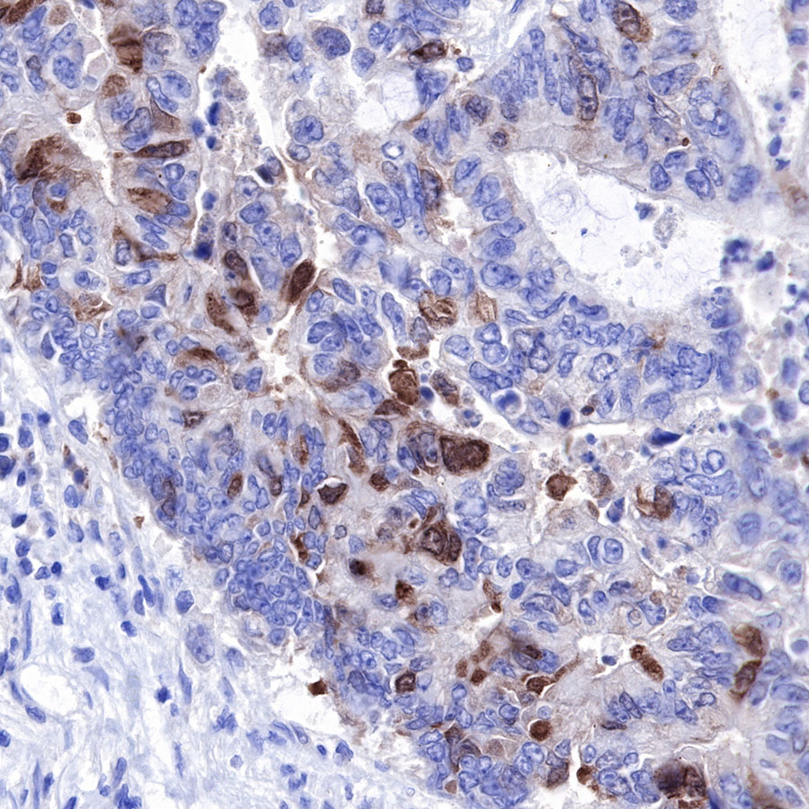 IHC shows positive staining in paraffin-embedded human colon cancer. Anti-PLK1 antibody was used at 1/200 dilution, followed by a HRP Polymer for Mouse & Rabbit IgG (ready to use). Counterstained with hematoxylin. Heat mediated antigen retrieval with Tris/EDTA buffer pH9.0 was performed before commencing with IHC staining protocol.