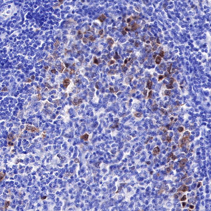 IHC shows positive staining in paraffin-embedded human tonsil. Anti-PLK1 antibody was used at 1/200 dilution, followed by a HRP Polymer for Mouse & Rabbit IgG (ready to use). Counterstained with hematoxylin. Heat mediated antigen retrieval with Tris/EDTA buffer pH9.0 was performed before commencing with IHC staining protocol.