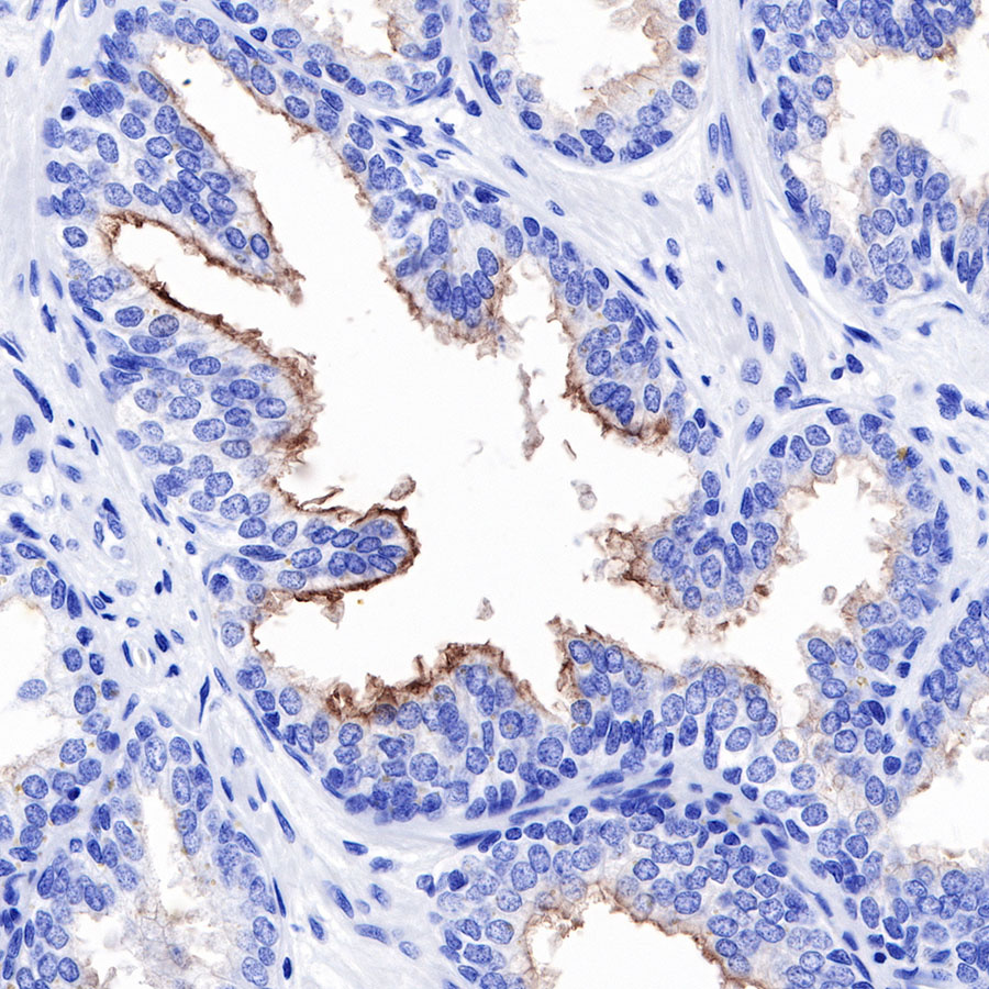 IHC shows positive staining in paraffin-embedded human prostatic hyperplasia. Anti-PSMA antibody was used at 1/4000 dilution, followed by a HRP Polymer for Mouse & Rabbit IgG (ready to use). Counterstained with hematoxylin. Heat mediated antigen retrieval with Tris/EDTA buffer pH9.0 was performed before commencing with IHC staining protocol.