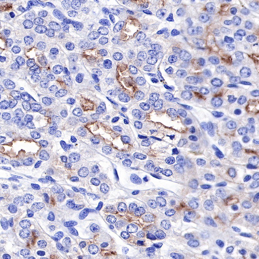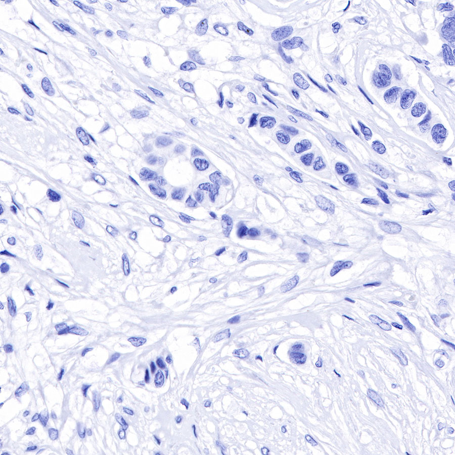Negative control: IHC shows negative staining in paraffin-embedded human breast cancer. Anti-PSMA antibody was used at 1/4000 dilution, followed by a HRP Polymer for Mouse & Rabbit IgG (ready to use). Counterstained with hematoxylin. Heat mediated antigen retrieval with Tris/EDTA buffer pH9.0 was performed before commencing with IHC staining protocol.