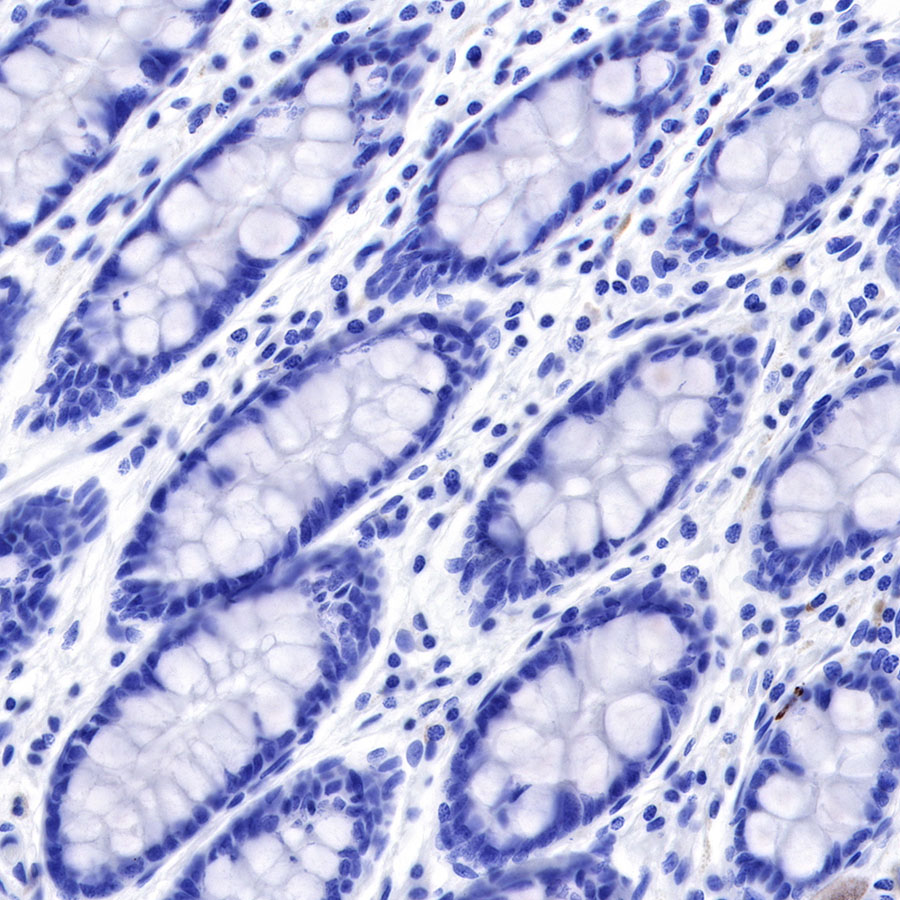 Negative control: IHC shows negative staining in paraffin-embedded human colon. Anti-PSMA antibody was used at 1/4000 dilution, followed by a HRP Polymer for Mouse & Rabbit IgG (ready to use). Counterstained with hematoxylin. Heat mediated antigen retrieval with Tris/EDTA buffer pH9.0 was performed before commencing with IHC staining protocol.