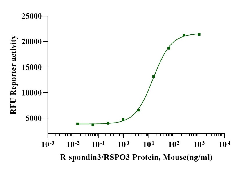 Measured by its binding ability in a functional ELISA. When Recombinant Mouse RNF43 mFC Chimera, is immobilized 2µg/mL (100 µl/well), Recombinant Mouse R-spondin3/RSPO3 His Tag binds with an EC50 of 0.02-0.036μg/ml.
