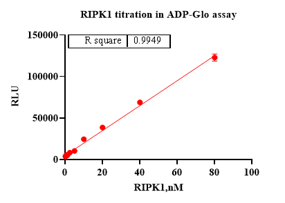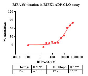 The RIPK1 activity was detected using Ultra Luminescence technology. The reaction was performed by incubating the RIPK1 protein, ATP and substrate at 25℃ for 120 min, then adding ADP-Glo reagent and reading RLU signal with BMG
