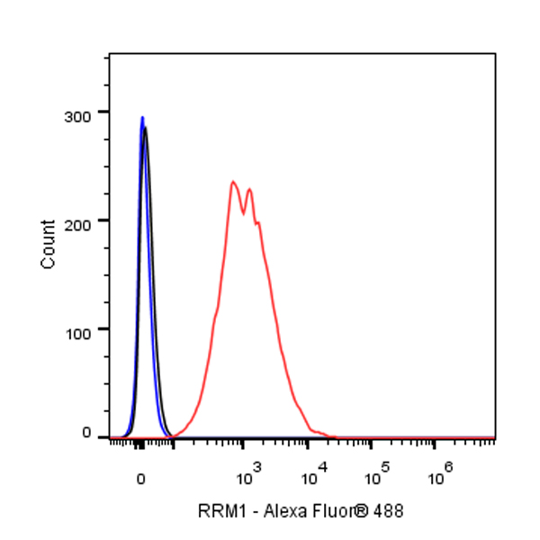 Flow cytometric analysis of 4% PFA fixed 90% methanol permeabilized HeLa (Human cervix adenocarcinoma epithelial cell) cells labelling RRM1 antibody at 1/50 (1 μg) dilution / (red) compared with a Rabbit monoclonal IgG (Black) isotype control and an unlabelled control (cells without incubation with primary antibody and secondary antibody) (Blue). Goat Anti - Rabbit IgG Alexa Fluor® 488 was used as the secondary antibody.