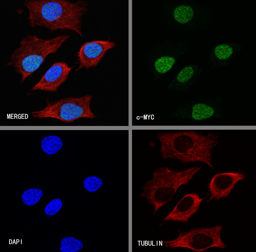 ICC shows positive staining in HeLa cells. Anti-c-Myc antibody was used at 1/500 dilution (Green) and incubated overnight at 4°C. Goat polyclonal Antibody to Rabbit IgG - H&L (Alexa Fluor® 488) was used as secondary antibody at 1/1000 dilution. The cells were fixed with 100% ice-cold methanol and permeabilized with 0.1% PBS-Triton X-100. Nuclei were counterstained with DAPI (Blue).Counterstain with tubulin (red).
