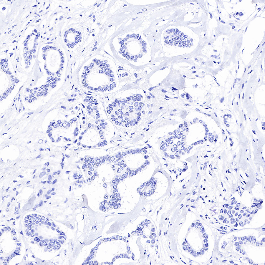 Negative control: IHC shows negative staining in paraffin-embedded human breast cancer. Anti-PSA antibody was used at 1/1000 dilution, followed by a HRP Polymer for Mouse & Rabbit IgG (ready to use). Counterstained with hematoxylin. Heat mediated antigen retrieval with Tris/EDTA buffer pH9.0 was performed before commencing with IHC staining protocol.