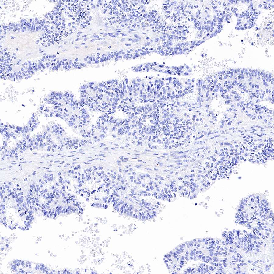 Negative control: IHC shows negative staining in paraffin-embedded human ovarian cancer. Anti-PSA antibody was used at 1/1000 dilution, followed by a HRP Polymer for Mouse & Rabbit IgG (ready to use). Counterstained with hematoxylin. Heat mediated antigen retrieval with Tris/EDTA buffer pH9.0 was performed before commencing with IHC staining protocol.