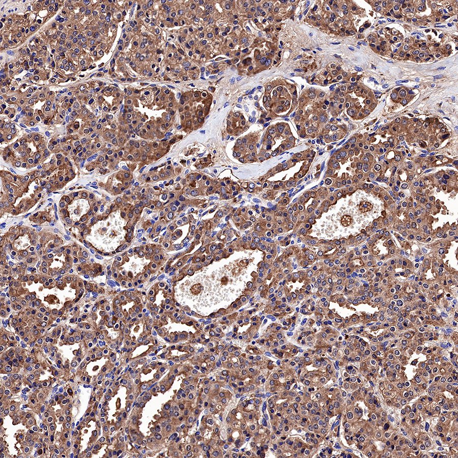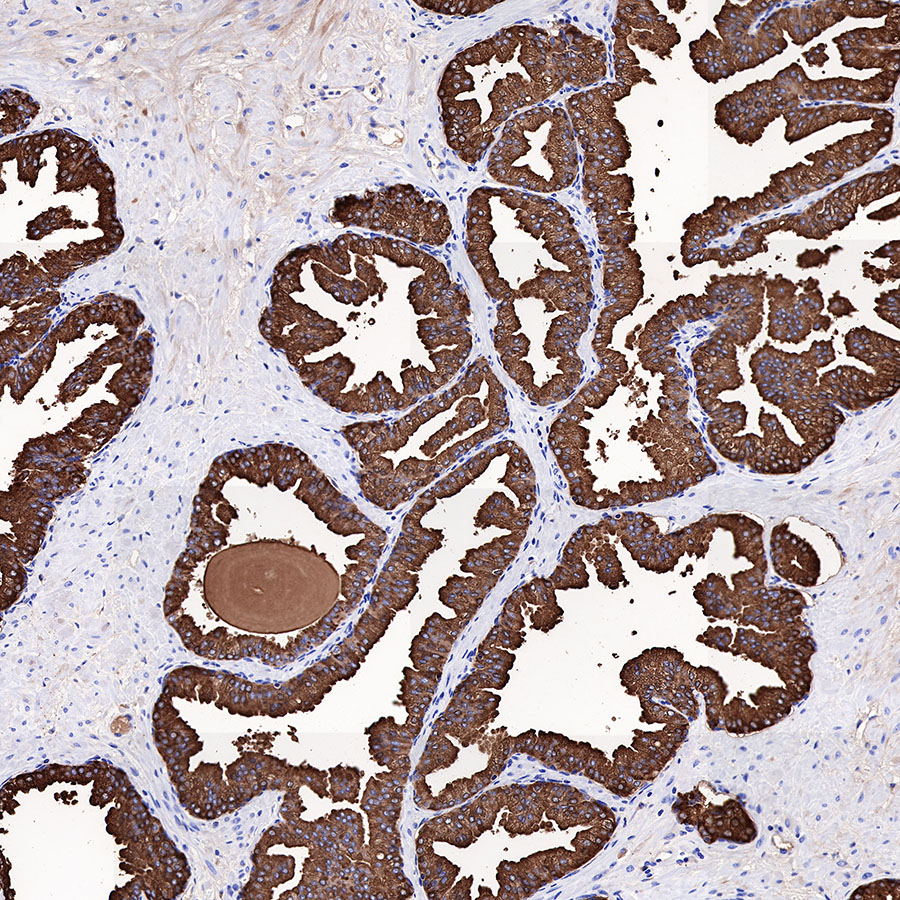 IHC shows positive staining in paraffin-embedded human prostatic hyperplasia. Anti-PSA antibody was used at 1/1000 dilution, followed by a HRP Polymer for Mouse & Rabbit IgG (ready to use). Counterstained with hematoxylin. Heat mediated antigen retrieval with Tris/EDTA buffer pH9.0 was performed before commencing with IHC staining protocol.