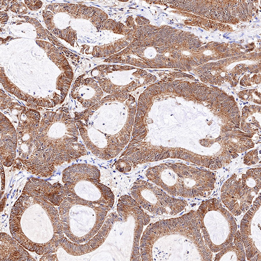 IHC shows positive staining in paraffin-embedded human colon cancer. Anti-Stat6 antibody was used at 1/500 dilution, followed by a HRP Polymer for Mouse & Rabbit IgG (ready to use). Counterstained with hematoxylin. Heat mediated antigen retrieval with Tris/EDTA buffer pH9.0 was performed before commencing with IHC staining protoco