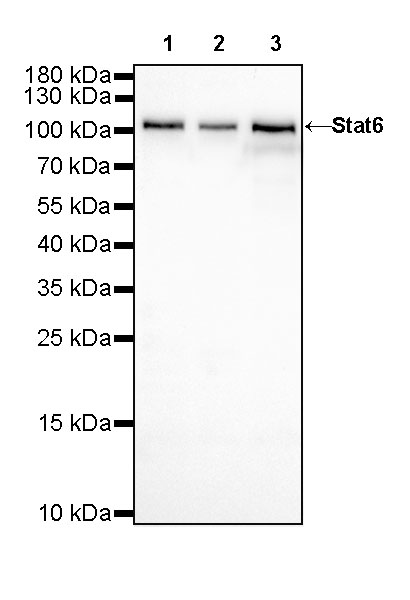 WB result of Stat6 Rabbit mAb Primary antibody: Stat6 Rabbit mAb at 1/1000 dilution Lane 1: HeLa whole cell lysate 20 µg Lane 2: Jurkat whole cell lysate 20 µg Lane 3: NIH/3T3 whole cell lysate 20 µg Secondary antibody: Goat Anti-Rabbit IgG, (H+L), HRP conjugated at 1/10000 dilution Predicted MW: 94kDa Observed MW: 110kDa