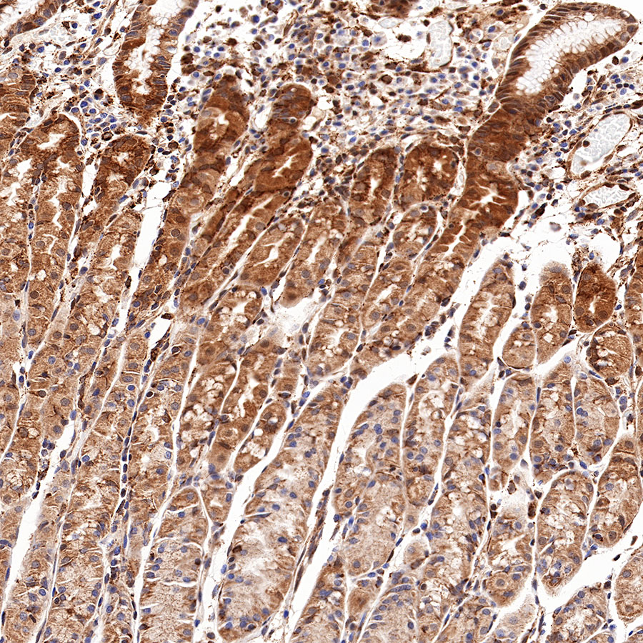 IHC shows positive staining in paraffin-embedded human stomach. Anti-Stat6 antibody was used at 1/500 dilution, followed by a HRP Polymer for Mouse & Rabbit IgG (ready to use). Counterstained with hematoxylin. Heat mediated antigen retrieval with Tris/EDTA buffer pH9.0 was performed before commencing with IHC staining protocol.