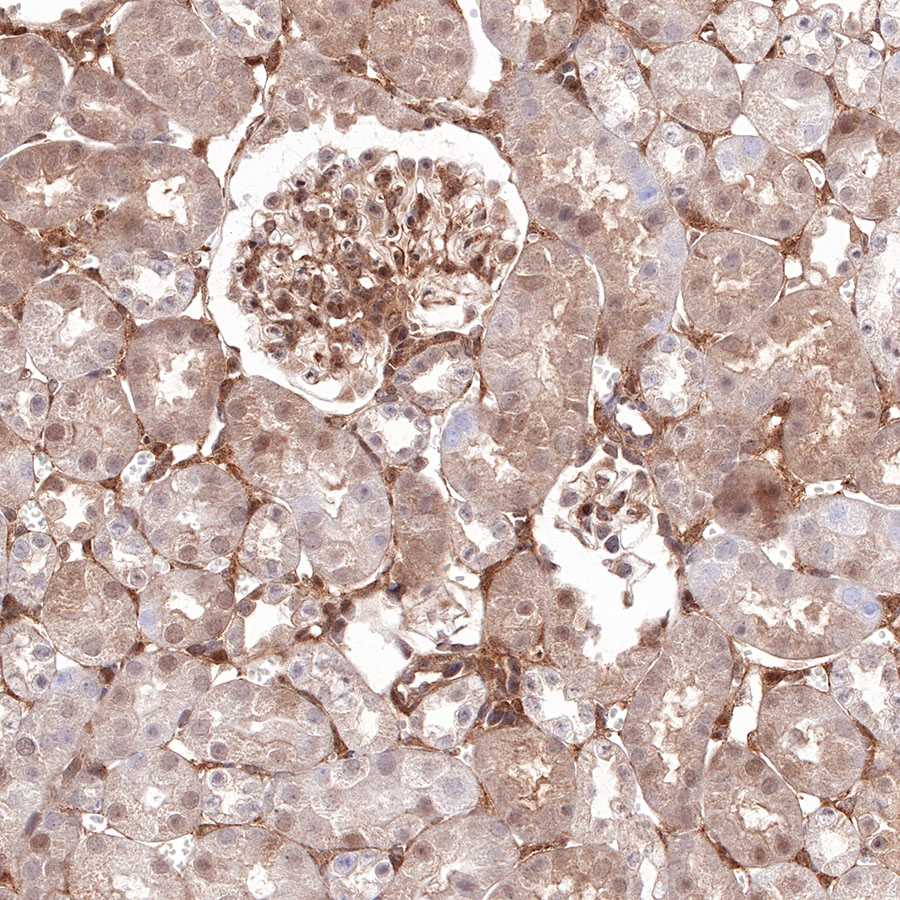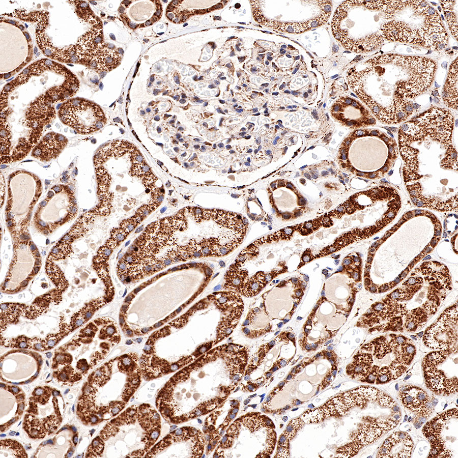 IHC shows positive staining in paraffin-embedded human kidney. Anti-Stat6 antibody was used at 1/500 dilution, followed by a HRP Polymer for Mouse & Rabbit IgG (ready to use). Counterstained with hematoxylin. Heat mediated antigen retrieval with Tris/EDTA buffer pH9.0 was performed before commencing with IHC staining protocol.