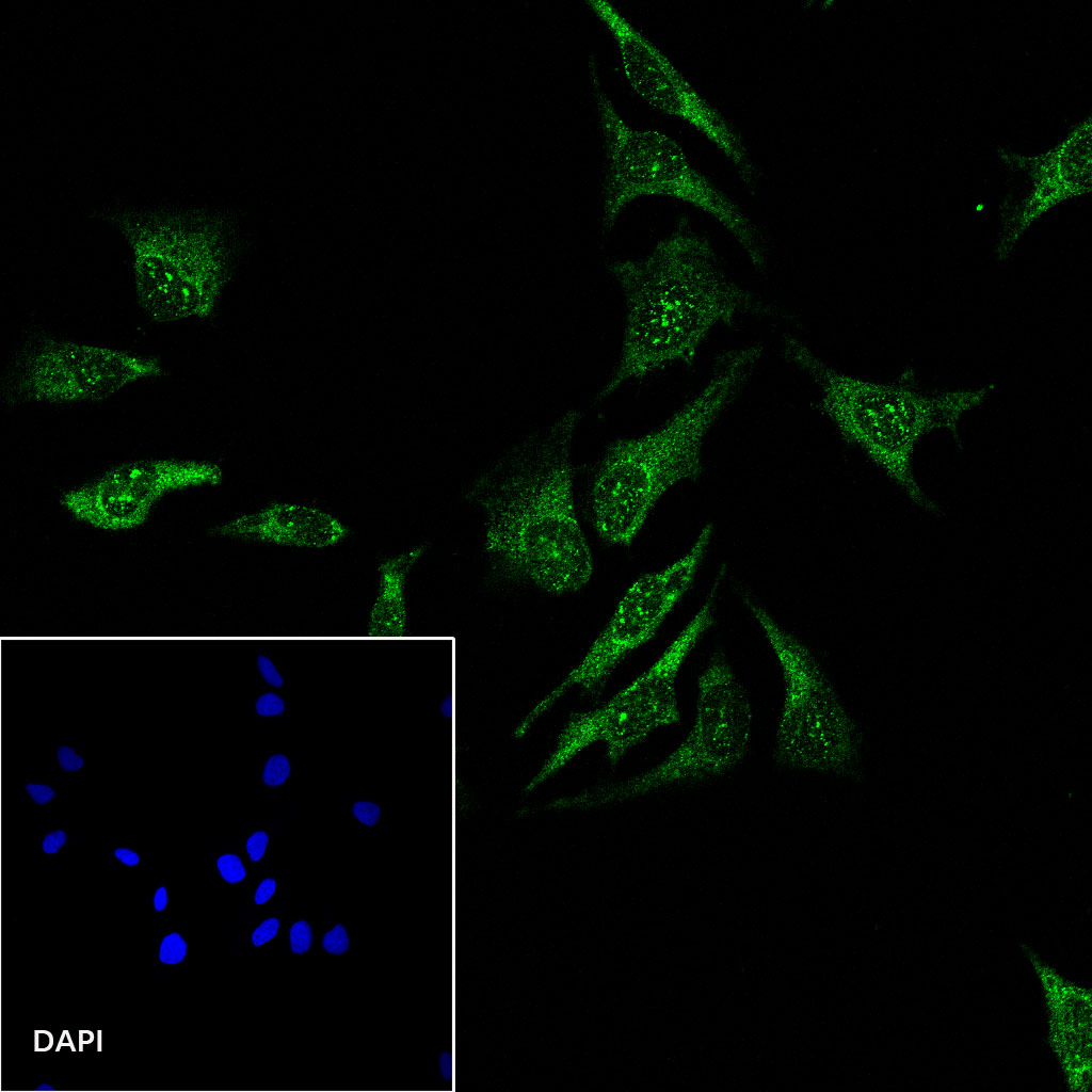 ICC shows positive staining in HeLa cells. Anti-Stat6 antibody was used at 1/250 dilution (Green) and incubated overnight at 4°C. Goat polyclonal Antibody to Rabbit IgG - H&L (Alexa Fluor® 488) was used as secondary antibody at 1/1000 dilution. The cells were fixed with 4% PFA and permeabilized with 0.1% PBS-Triton X-100. Nuclei were counterstained with DAPI (Blue).