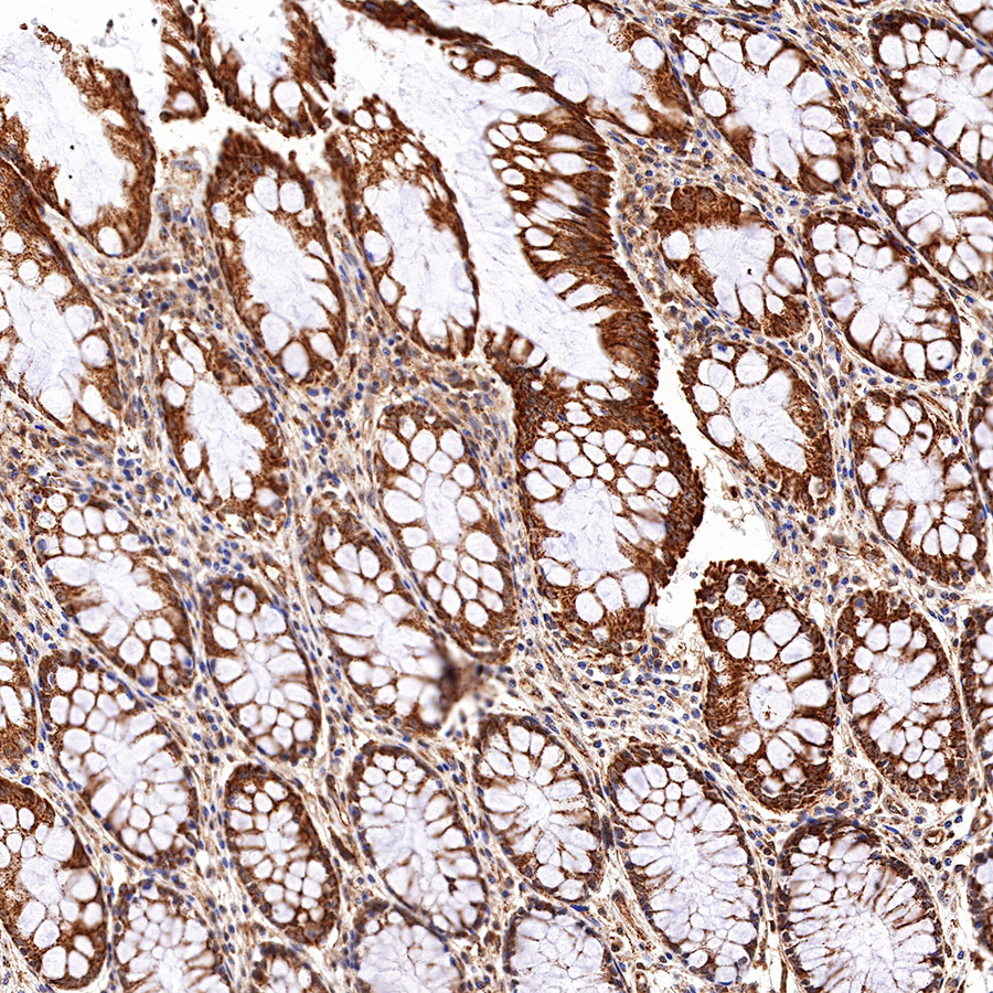 IHC shows positive staining in paraffin-embedded human colon. Anti-Stat6 antibody was used at 1/500 dilution, followed by a HRP Polymer for Mouse & Rabbit IgG (ready to use). Counterstained with hematoxylin. Heat mediated antigen retrieval with Tris/EDTA buffer pH9.0 was performed before commencing with IHC staining protocol.