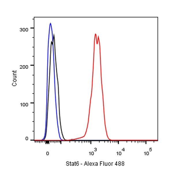 Flow cytometric analysis of HeLa cells labelling Stat6 antibody at 1/500 (0.1 μg) dilution/ (red) compared with a Rabbit monoclonal IgG (Black) isotype control and an unlabelled control (cells without incubation with primary antibody and secondary antibody) (Blue). Goat Anti-Rabbit IgG Alexa Fluor® 488 was used as the secondary antibody.