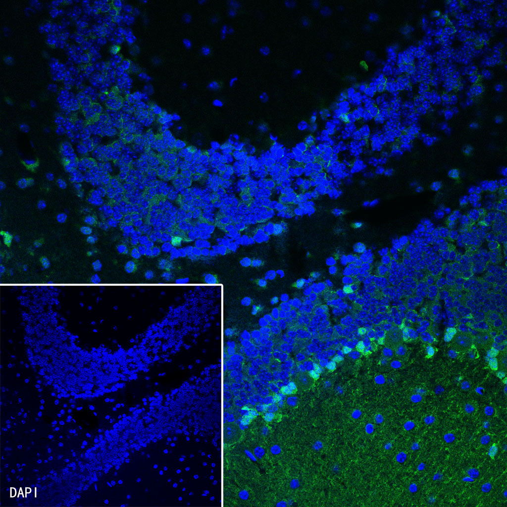 IF shows positive staining in paraffin-embedded mouse cerebellum. Anti-S100B antibody was used at 1/1250 dilution (Green) and incubated overnight at 4°C. Goat polyclonal Antibody to Rabbit IgG - H&L (Alexa Fluor® 488) was used as secondary antibody at 1/1000 dilution. Counterstained with DAPI (Blue). Heat mediated antigen retrieval with Tris/EDTA buffer pH9.0 was performed before commencing with IF staining protocol.