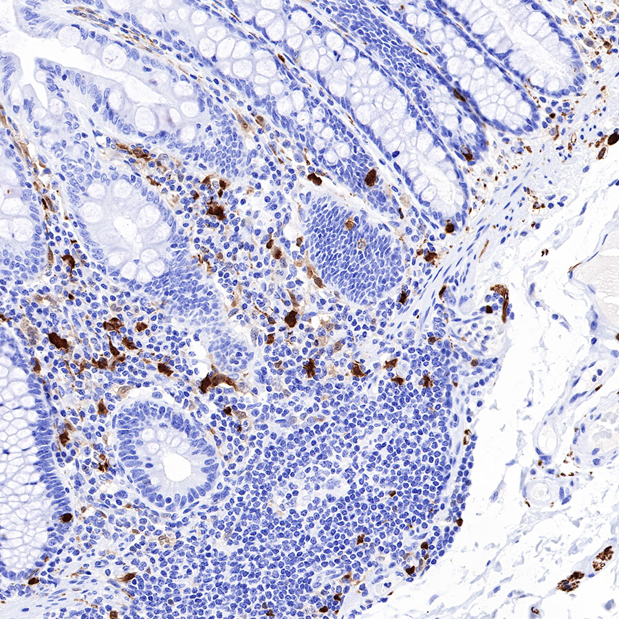 IHC shows positive staining in paraffin-embedded human colon. Anti-S100B antibody was used at 1/2500 dilution, followed by a HRP Polymer for Mouse & Rabbit IgG (ready to use). Counterstained with hematoxylin. Heat mediated antigen retrieval with Tris/EDTA buffer pH9.0 was performed before commencing with IHC staining protocol.