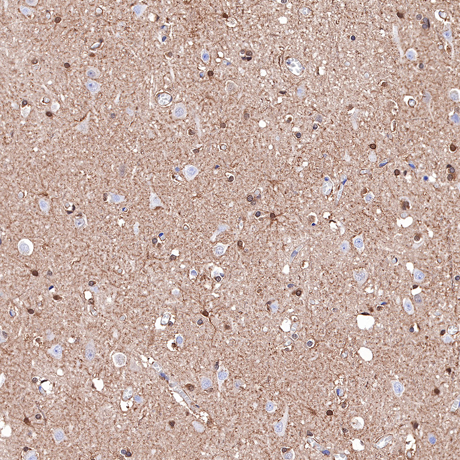 IHC shows positive staining in paraffin-embedded human cerebral cortex. Anti-S100B antibody was used at 1/2500 dilution, followed by a HRP Polymer for Mouse & Rabbit IgG (ready to use). Counterstained with hematoxylin. Heat mediated antigen retrieval with Tris/EDTA buffer pH9.0 was performed before commencing with IHC staining protocol.
