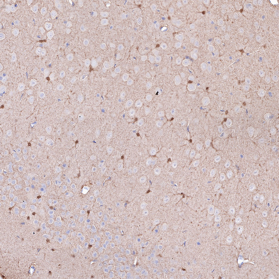 IHC shows positive staining in paraffin-embedded mouse cerebral cortex. Anti-S100B antibody was used at 1/2500 dilution, followed by a HRP Polymer for Mouse & Rabbit IgG (ready to use). Counterstained with hematoxylin. Heat mediated antigen retrieval with Tris/EDTA buffer pH9.0 was performed before commencing with IHC staining protocol.