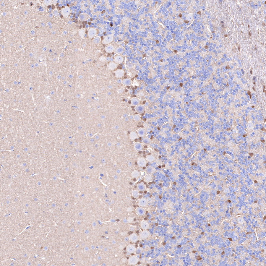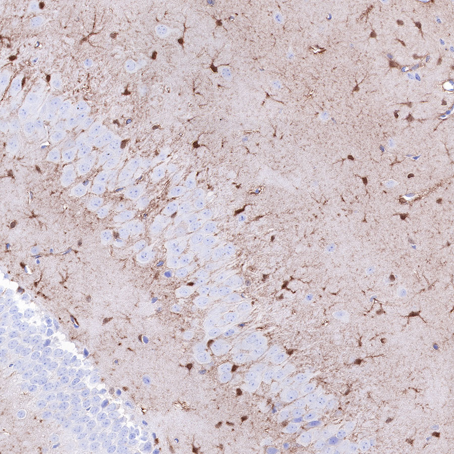 IHC shows positive staining in paraffin-embedded mouse cerebellum. Anti-S100B antibody was used at 1/2500 dilution, followed by a HRP Polymer for Mouse & Rabbit IgG (ready to use). Counterstained with hematoxylin. Heat mediated antigen retrieval with Tris/EDTA buffer pH9.0 was performed before commencing with IHC staining protocol.