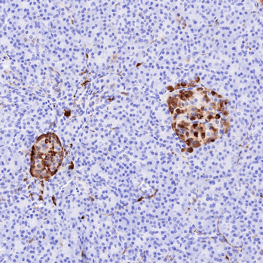 IHC shows positive staining in paraffin-embedded human pancreas. Anti-S100B antibody was used at 1/2500 dilution, followed by a HRP Polymer for Mouse & Rabbit IgG (ready to use). Counterstained with hematoxylin. Heat mediated antigen retrieval with Tris/EDTA buffer pH9.0 was performed before commencing with IHC staining protocol.