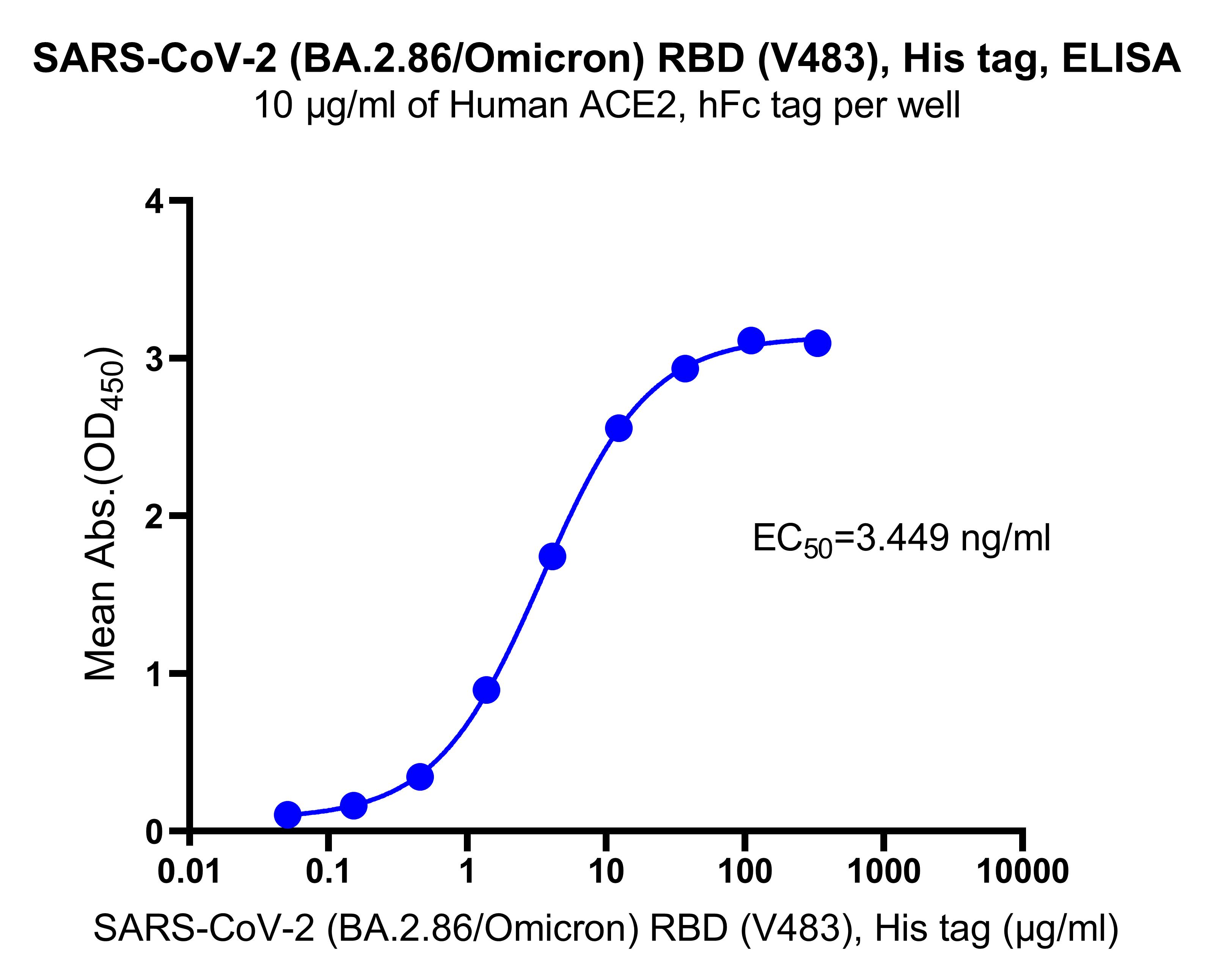 Immobilized Human ACE2, hFc tag (Cat. No. S0A0071) at 10 μg/mL (50 μL/well) can bind SARS-CoV-2 (BA.2.86/Omicron) RBD (V483), His tag with EC50 of 3.221-3.691 ng/ml.