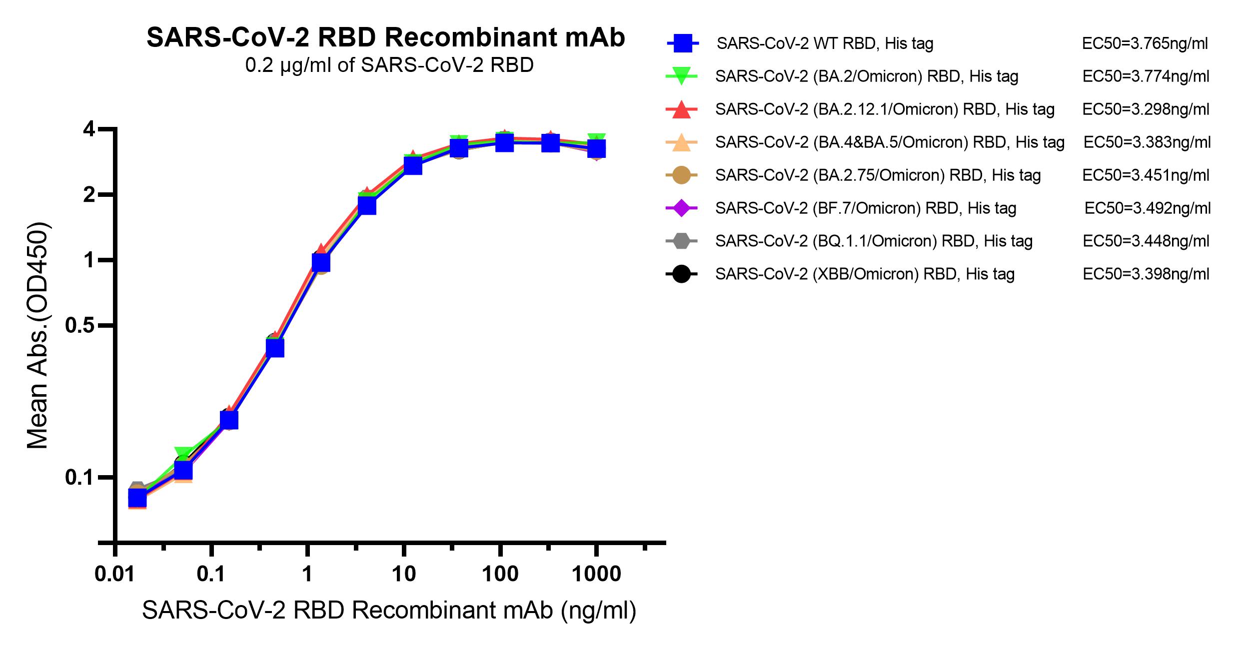 Anti-SARS-CoV-2 RBD Antibody (dilutions start from 1 μg/ml) can bind to Immobilized SARS-CoV-2 WT RBD, His tag(S0A2008); SARS-CoV-2 (BA.2/Omicron) RBD, His tag(S0A2003); SARS-CoV-2 (BA.2.12.1/Omicron) RBD, His tag(S0A2015); SARS-CoV-2 (BA.4&BA.5/Omicron) RBD, His tag(S0A2004); SARS-CoV-2 (BA.2.75/Omicron) RBD, His tag (S0A2028); SARS-CoV-2 (BF.7/Omicron) RBD, His tag (S0A2020); SARS-CoV-2 (BQ.1.1/Omicron) RBD, His tag (S0A2021); SARS-CoV-2 (XBB/Omicron) RBD, His tag (S0A2022) at 0.2 μg/ml (50 μl/well) as coating antigen.
