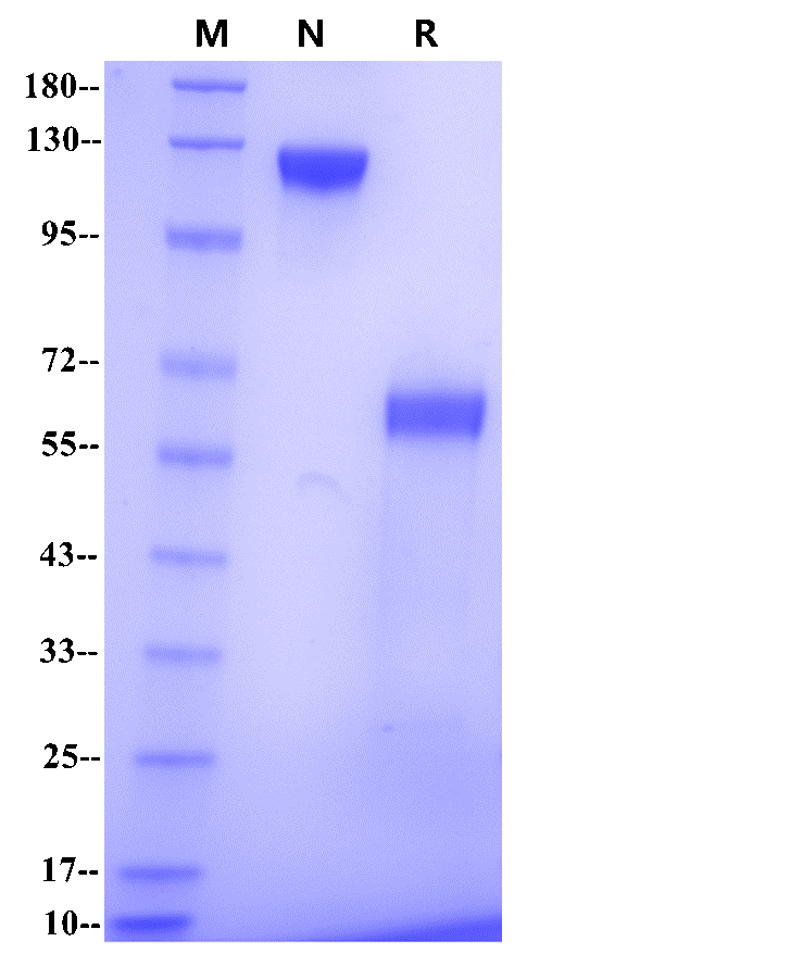 Siglec-15 mFc Chimera, Human ,2μg on SDS-PAGE under Non-reducing and reducing condition. The purity is greater than 95%.