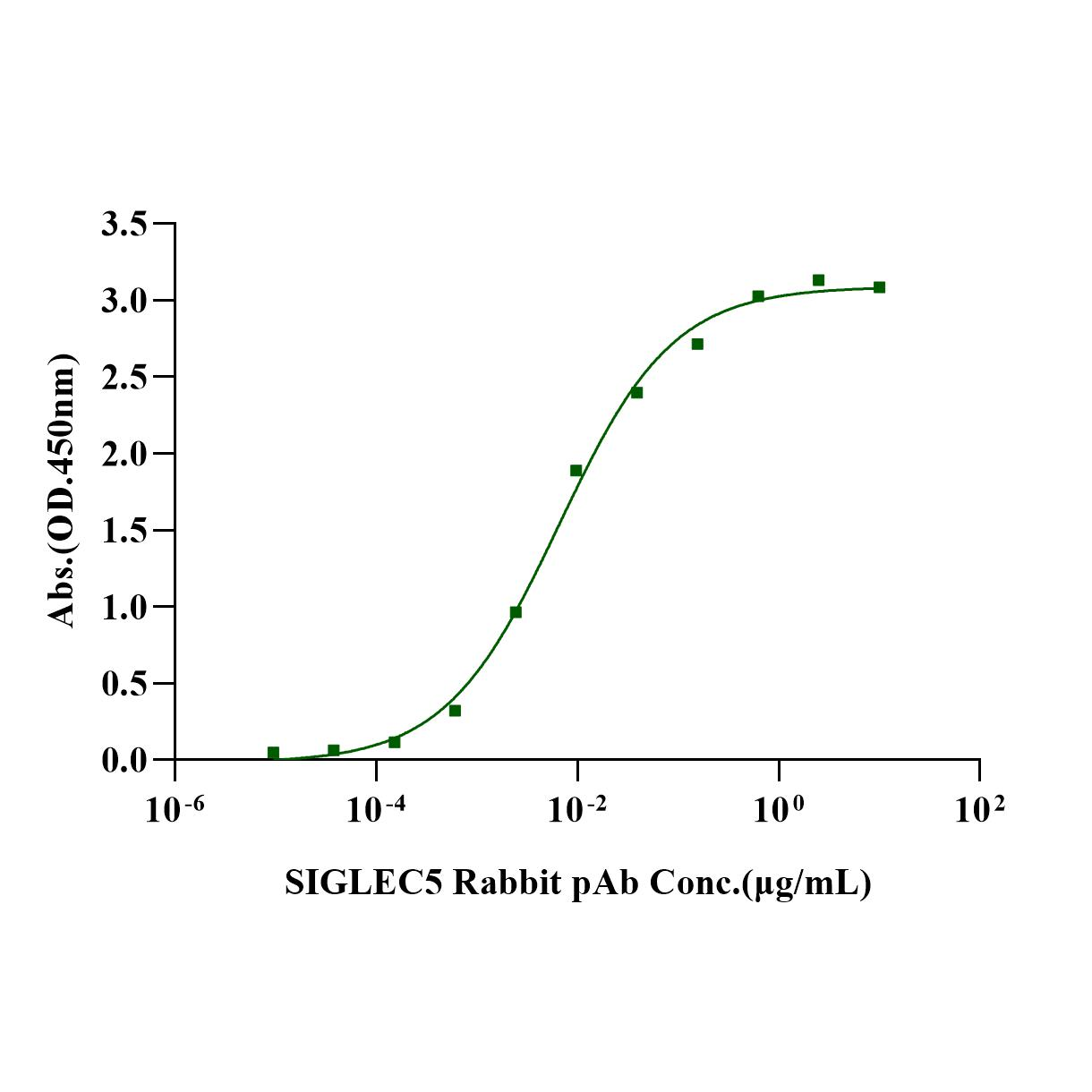 Immobilized Siglec-5 His Tag Protein, Human (Cat. No. UA010074) at 2.0μg/mL (100μL/well) can bind SIGLEC5 Rabbit pAb with EC50 of 4.84-9.00 ng/mL.