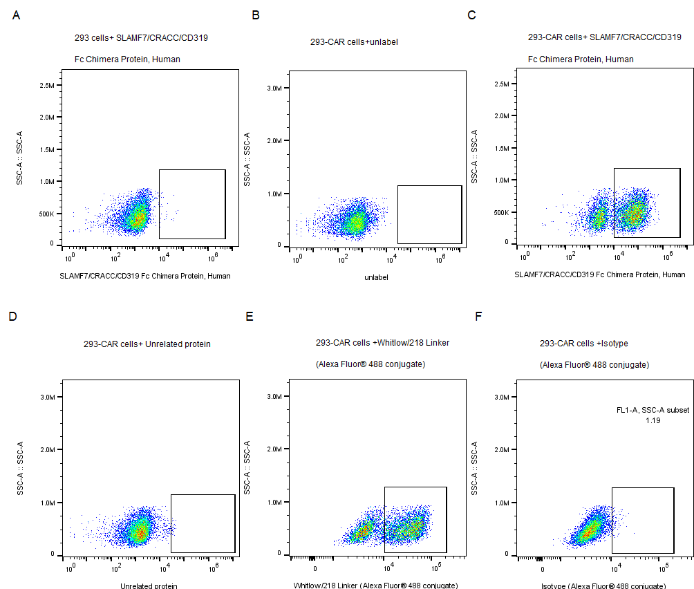 2e5 of transient transfected anti-SLAMF7 ScFv CAR-293 cells were stained with 0.1ug SLAMF7/CRACC/CD319 Fc Chimera Protein, Human, (Cat. No. UA010339) and unlabel respectively and unrelated protein (Fig. C and B and D), and non-transfected 293 cells were used as a control (Fig. A). Alexa Fluor® 647 signal was used to evaluate the binding activity. 2e5 of transient transfected anti-SLAMF7 ScFv CAR-293 cells were stained with isotype and Whitlow/218 Linker-Alexa Fluor® 488 (Fig. F and E). Alexa Fluor® 488 signal was used to evaluate the binding activity.