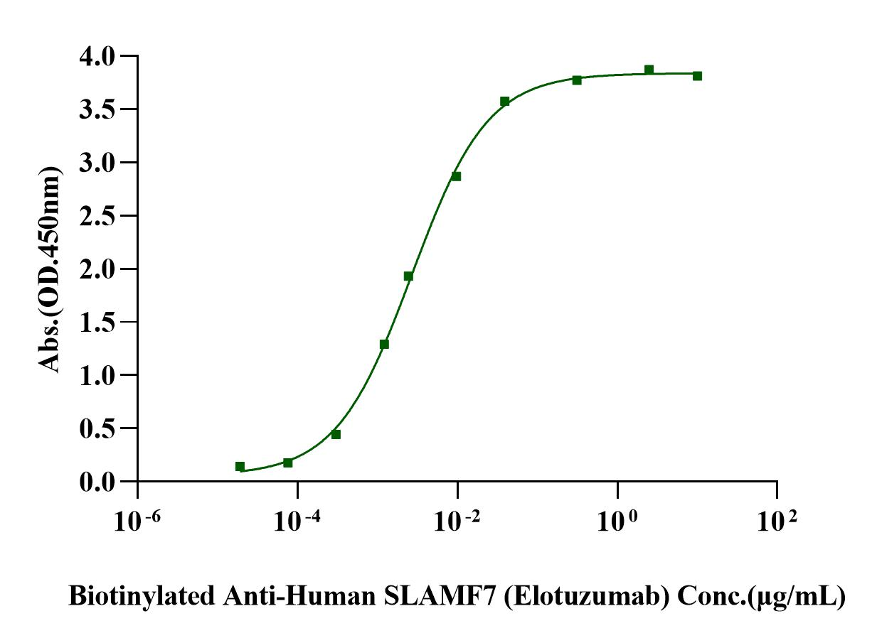 Immobilized SLAMF7/CRACC/CD319 Fc Chimera Protein, Human (Cat. No. UA010339) at 2.0μg/mL (100μL/well) can bind Biotinylated Anti-Human SLAMF7 (Elotuzumab) with EC50 of 2.32-3.16ng/mL.
