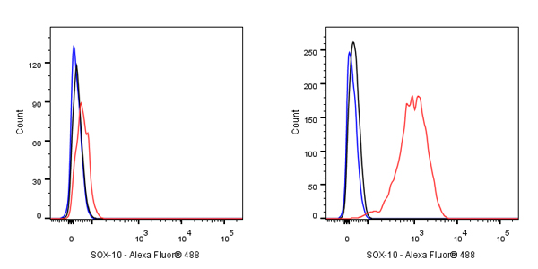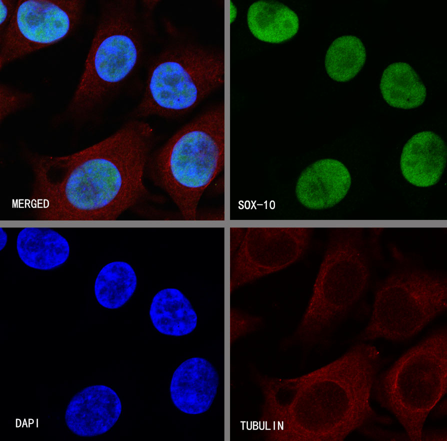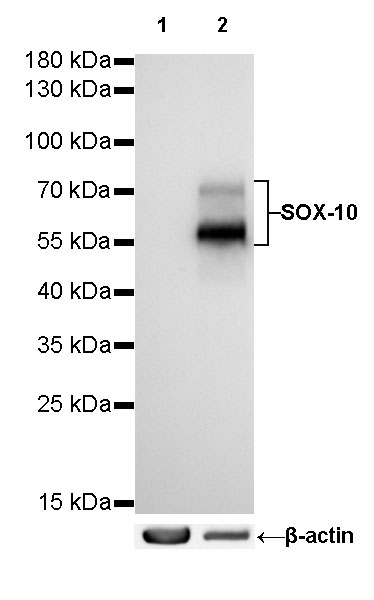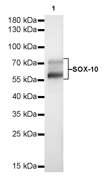 Transcription factor SOX-10 is a protein that in humans is encoded by the SOX10 gene. This gene encodes a member of the SOX (SRY-related HMG-box) family of transcription factors involved in the regulation of embryonic development and determination of cell fate. The encoded protein acts as a transcriptional activator after forming a protein complex with other proteins. This protein acts as a nucleocytoplasmic shuttle protein and is important for neural crest and peripheral nervous system development.