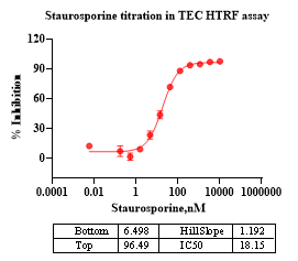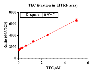 The TEC activity was detected using HTRF technology. The reaction was performed by incubating the TEC protein , ATP and substrate at 25℃ for 60 min, adding the beads at 25℃ for 60 min, then reading ratio 665/620 with BMG.