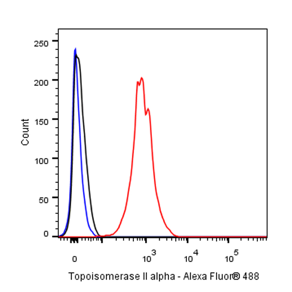 Flow cytometric analysis of 4% PFA fixed 90% methanol permeabilized HeLa (Human cervix adenocarcinoma epithelial cell) cells labeling Topoisomerase II alpha at 1/500 dilution (0.1 μg) / (red) compared with a rabbit monoclonal IgG isotype control (black) and an unlabeled control (cells without incubation with primary antibody and secondary antibody) (Blue). Goat Anti - Rabbit IgG Alexa Fluor® 488 was used as the secondary antibody.