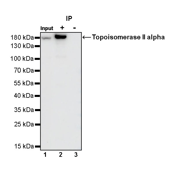 Western blot was performed on the immunoprecipitate using Topoisomerase II alpha Rabbit mAb at 1/1000 dilution.