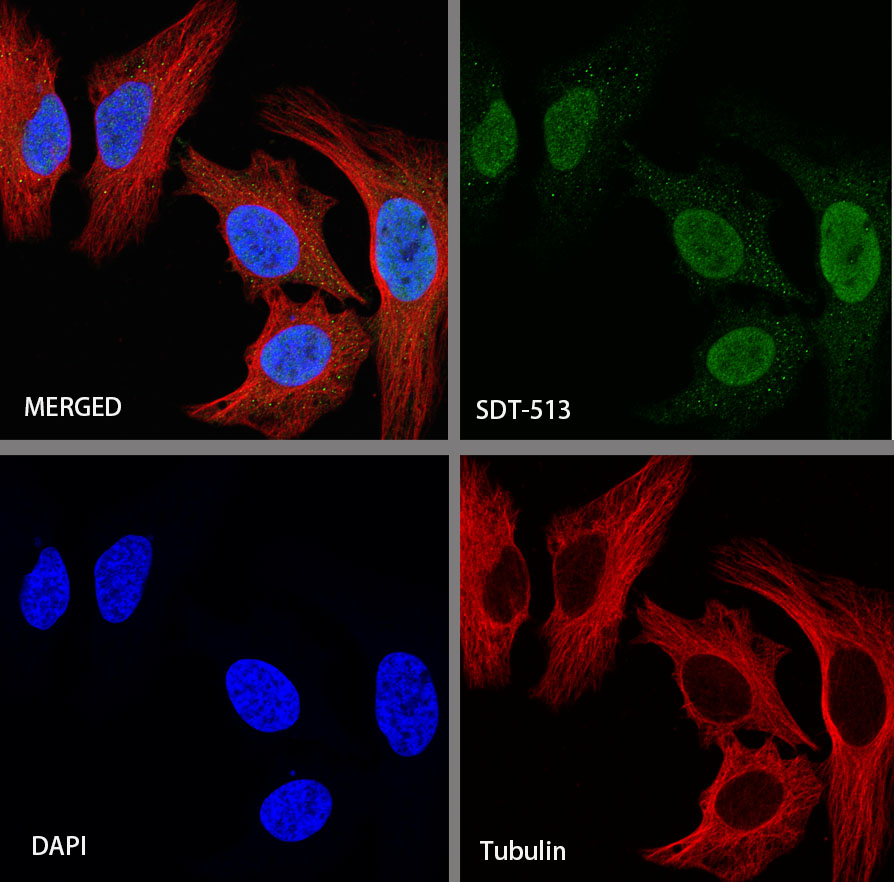 ICC shows positive staining in HeLa cells. Anti-Topoisomerase II alpha antibody was used at 1/500 dilution (Green) and incubated overnight at 4°C. Goat polyclonal Antibody to Rabbit IgG - H&L (Alexa Fluor® 488) was used as secondary antibody at 1/1000 dilution. The cells were fixed with 4%PFA and permeabilized with 0.1% PBS-Triton X-100. Nuclei were counterstained with DAPI (Blue).