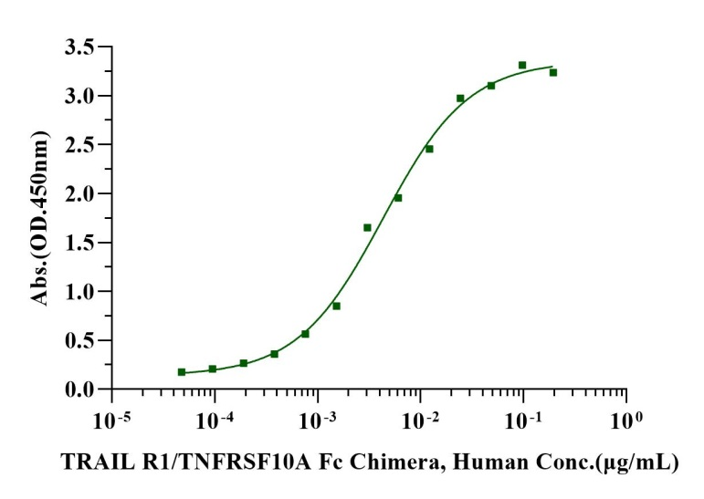 Immobilized TRAIL/Apo2L, Human (Cat. No. UA040039) at 2.0μg/mL (100μL/well) can bind TRAIL R1/TNFRSF10A Fc Chimera, Human (Cat. No. UA010630) with EC50 of 3.51-5.40 ng/mL.
