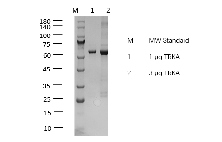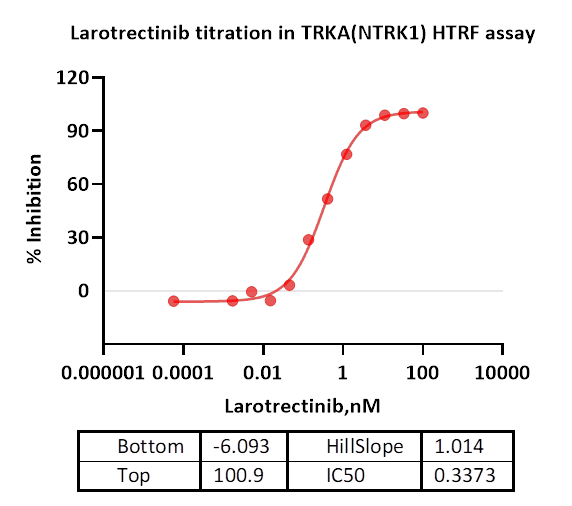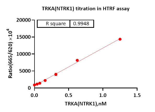 The TRKA activity was detected using HTRF technology. The reaction was performed by incubating the TRKA protein , ATP and substrate at 25℃ for 60 min, adding the beads at 25℃ for 60 min, then reading ratio 665/620 with BMG.