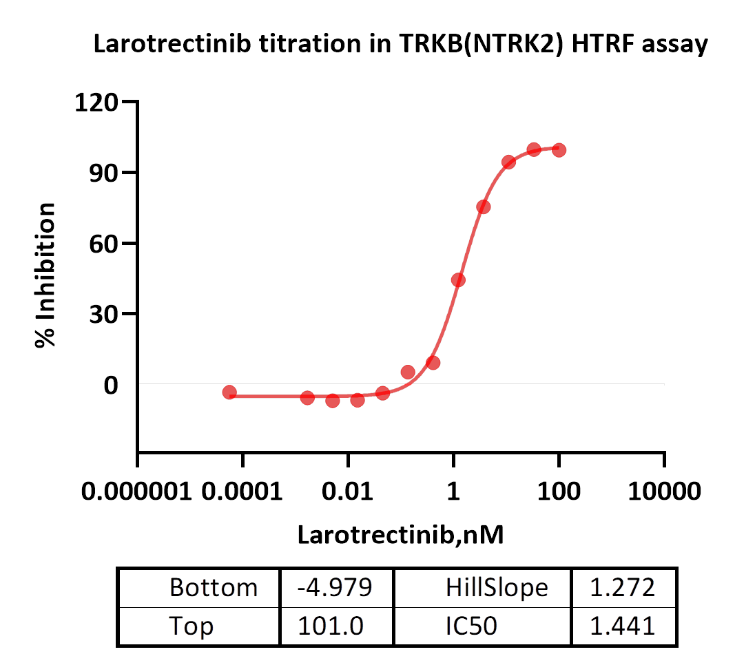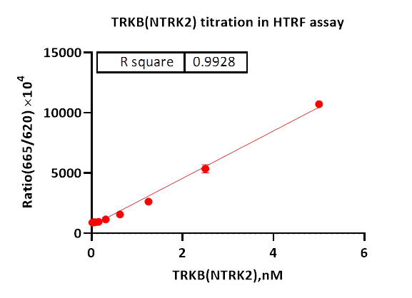 The TRKB activity was detected using HTRF technology. The reaction was performed by incubating the TRKB protein , ATP and substrate at 25℃ for 60 min, adding the beads at 25℃ for 60 min, then reading ratio 665/620 with BMG.