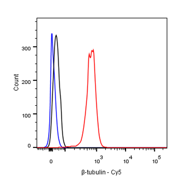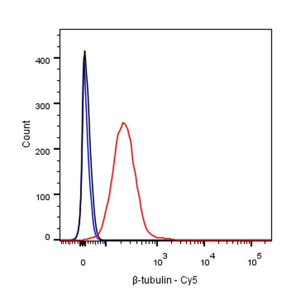 Flow cytometric analysis of 4% PFA fixed 90% methanol permeabilized HepG2 (Human hepatocellular carcinoma epithelial cell) cells labeldcfxling β-tubulin (Cy5 Conjugate) antibody at 1/20000 dilution (0.01 μg)/ (Red) compared with a Rabbit monoclonal IgG (Black) isotype control and an unlabelled control (cells without incubation with primary antibody and secondary antibody) (Blue).