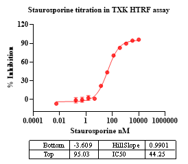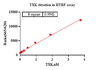 The TXK activity was detected using HTRF technology. The reaction was performed by incubating the TXK protein, ATP and substrate at 25℃ for 60 min, adding the beads at 25℃ for 60 min, then reading ratio 665/620 with BMG