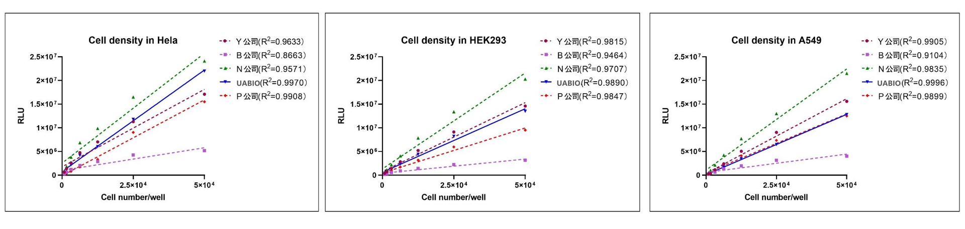 与同类竞品产品线性比较: 用细胞计数板计数Hela细胞、HEK293细胞、A549细胞,并将细胞浓度调整到5X105/ml,两倍系列稀释的细胞分别接种于96孔透明底白板,100µl/孔;加入平衡至室温的UA-Glo细胞活力检测试剂、国产同类竞品试剂、进口同类竞品试剂(P公司),50µl/孔,混匀;10分钟后读取荧光值。结果显示,在这三个细胞中,UA-Glo细胞活力检测试剂(Neubo)的线性均最优。