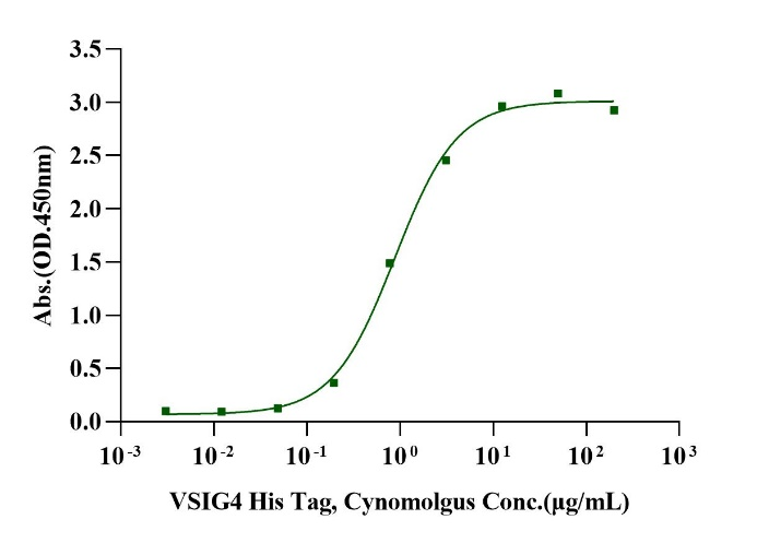 Immobilized human iC3b at 5.0μg/mL (100μL/well) can bind VSIG4 His Tag, Cynomolgus (Cat. No. UUA010980)with EC50 of 0.71-1.11 μg/ mL.